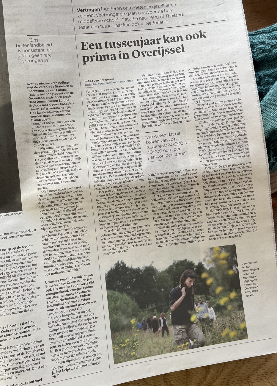 Als team vanuit NatuurCollege zijn we zelf ook het meest enthousiast over het ontwikkelen van inhoudelijke leerlijnen. Maar we realiseren ons dat we als initiatiefnemer ook de verantwoordelijkheid hebben om realistisch te zijn en de financiering en het draagvlak buiten onze groene bubbel te organiseren. We werken daarom dankzij een enthousiaste werkgroep aan een brief gericht aan de nieuwe minister van onderwijs en de minister voor jongerenzorg. Er is landelijke steun nodig om de moedige stappen van de provincie Overijssel te ondersteunen. Er is mogelijk ook een sterker verband nodig tussen de verschillende tussenjaar aanbieders. En er is een duidelijk verhaal nodig voor financiers, want er zijn zoveel overheidsprogramma’s (wereldwijd) geschrapt dat de oproep om steun aan ideële organisaties de beperkte groep financiers steeds kritischer maakt.