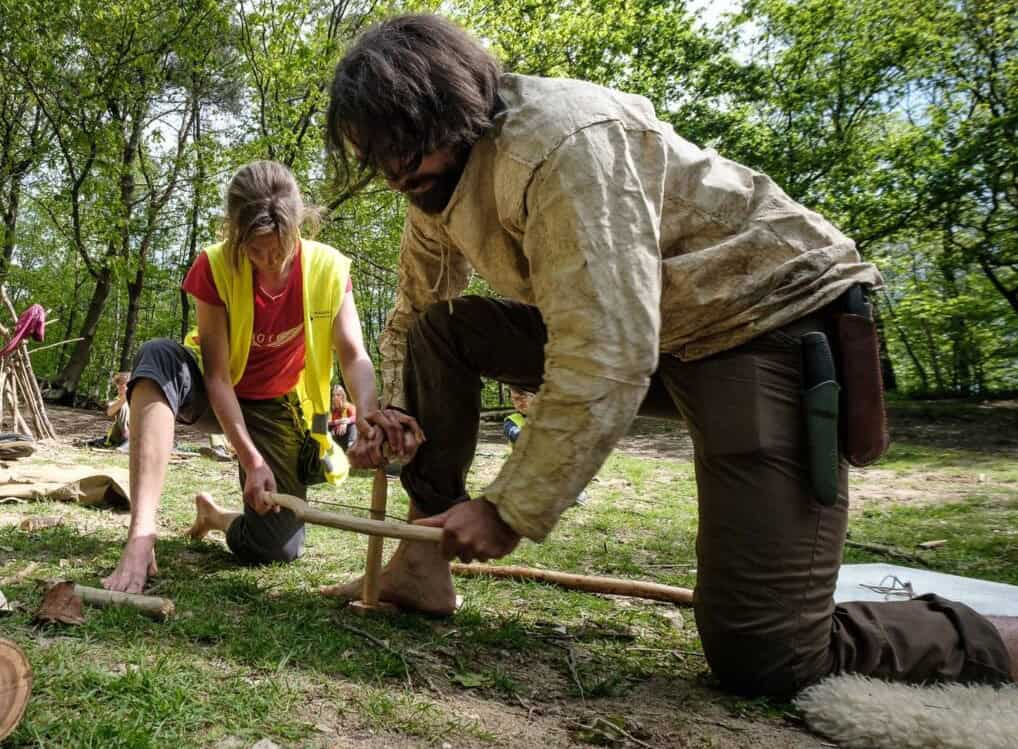 “Ik vond het heel leerzaam en leuk, we deden totaal iets anders dan normaal op school. Je werd losgelaten in wat en hoe je het deed, je mocht zelf de spullen pakken en uitvinden hoe het moest. We hebben vuur leren maken op verschillende manieren, bijvoorbeeld een vuurboog en vuursteen. Rond het vuur hebben we vuurverhalen met een boodschap voor de natuur opgevoerd. We leerden over welke planten/bloemen je wel en niet kan eten en vervolgens hebben we daar soep van gekookt. We hebben ook spellen gedaan waarbij je in de huid van dieren kruipt, bijvoorbeeld een vos. Ik zou zo’n week gunnen aan iedereen!” _ Leerling Corlaer College Nijkerk